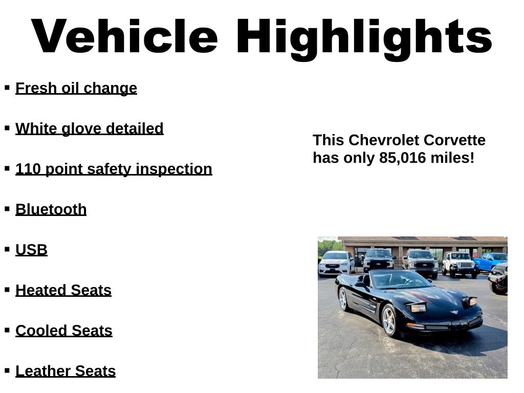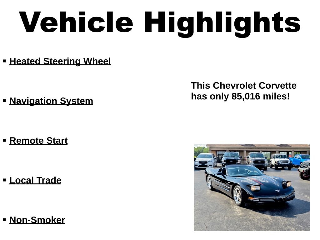 WE ARE THE LARGEST LUXURY PRE-OWNED DEALER IN KENTUCKIANA WITH 49 YEARS OF EXPERIENCE, A+ BBB RATING! THIS CHEVROLET CORVETTE CONVERTIBLE IS CERTIFIED BY CARFAX – NO ACCIDENTS! ONLY 83K MILES ** LOCAL TRADE ** NON SMOKER & GARAGE KEPT ** IMPECCABLE SERVICE RECORDS ** THIS CORVETTE IS LIKE NEW ** COMES WITH A PHENOMENAL PREVIOUS OWNER RECOMMENDATION ** THIS CORVETTE IS A S CLEAN AS THE PICTURES ** EVERY VEHICLE LOOKS GREAT IN PICTURES... BUT ON A SCALE OF 1-10, MOST DEALERS SELL A 5 OR 6. WE ONLY SELL A 9 OR 10!! ** THIS VEHICLE IS LIKE NEW AND NEEDS ABSOLUTELY NOTHING. WHY PAY MORE WHEN YOU CAN'T TELL THE DIFFERENCE? WHY BUY NEW WHEN YOU CAN BUY SUPERIOR QUALITY FOR LESS?! WE'RE KNOWN IN KENTUCKIANA FOR CLEAN, LIKE-NEW VEHICLES INSIDE AND OUT, AND OUR GOOGLE REVIEWS PROVE IT. STOP SHOPPING AND START DRIVING TODAY! OUR INTERNET SPECIAL IS PRICED TO MOVE QUICKLY, SO DON'T WAIT! ANY QUESTIONS? CONTACT JIMMY SMITH OR RICHARD SPAN AT 812-280-8018.