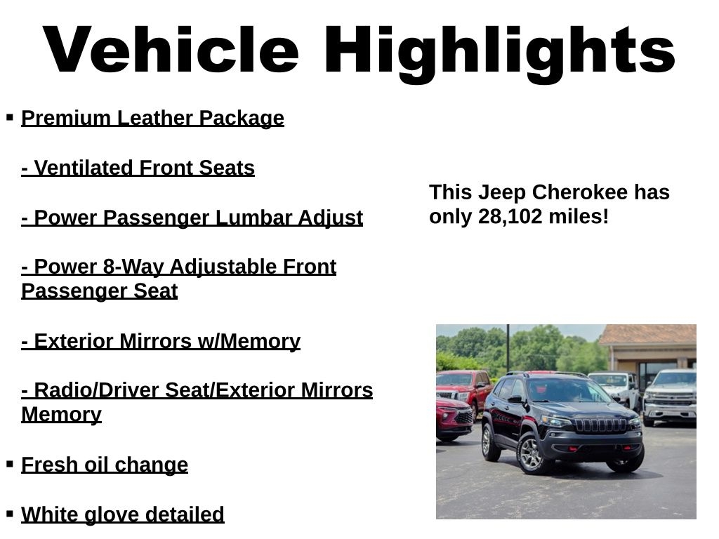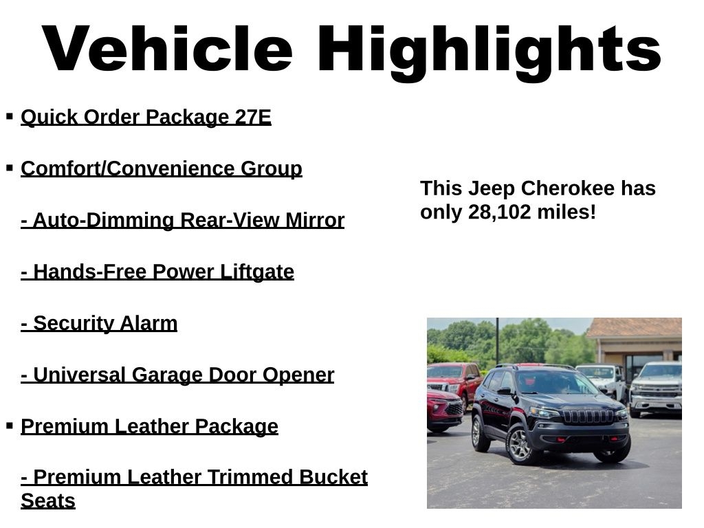 WE ARE THE LARGEST LUXURY PRE-OWNED DEALER IN KENTUCKIANA WITH 49 YEARS OF EXPERIENCE, A+ BBB RATING! THIS JEEP CHEROKEE TRAILHAWK IS CERTIFIED BY CARFAX 1 OWNER & NO ACCIDENTS! ** ONLY 28K MILES ** AWD/4X4/4WD ** IMPECCABLE SERVICE RECORDS ** LIKE NEW CONDITION INSIDE AND OUT ** HEATED LEATHER ** PREMIUM WHEELS ** NON SMOKER & GARAGE KEPT ** EVERY VEHICLE LOOKS GREAT IN PICTURES... BUT ON A SCALE OF 1-10, MOST DEALERS SELL A 5 OR 6. WE ONLY SELL A 9 OR 10!! ** THIS VEHICLE IS LIKE NEW AND NEEDS ABSOLUTELY NOTHING. WHY PAY MORE WHEN YOU CAN'T TELL THE DIFFERENCE? WHY BUY NEW WHEN YOU CAN BUY SUPERIOR QUALITY FOR LESS?! WE'RE KNOWN IN KENTUCKIANA FOR CLEAN, LIKE-NEW VEHICLES INSIDE AND OUT, AND OUR GOOGLE REVIEWS PROVE IT. STOP SHOPPING AND START DRIVING TODAY! OUR INTERNET SPECIAL IS PRICED TO MOVE QUICKLY, SO DON'T WAIT! ANY QUESTIONS? CONTACT JIMMY SMITH OR RICHARD SPAN AT 812-280-8018.