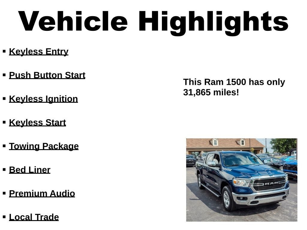 WE ARE THE LARGEST LUXURY PRE-OWNED DEALER IN KENTUCKIANA WITH 49 YEARS OF EXPERIENCE, A+ BBB RATING! THIS RAM 1500 BIG HORN IS CERTIFIED BY CARFAX NO ACCIDENTS! ** LOCAL TRADE ** SUPER CLEAN INSIDE AND OUT ** IMPECCABLE SERVICE RECORDS ** WAY TOO MANY OPTIONS TO LIST ** EVERY VEHICLE LOOKS GREAT IN PICTURES... BUT ON A SCALE OF 1-10, MOST DEALERS SELL A 5 OR 6. WE ONLY SELL A 9 OR 10!! ** THIS VEHICLE IS LIKE NEW AND NEEDS ABSOLUTELY NOTHING. WHY PAY MORE WHEN YOU CAN'T TELL THE DIFFERENCE? WHY BUY NEW WHEN YOU CAN BUY SUPERIOR QUALITY FOR LESS?! WE'RE KNOWN IN KENTUCKIANA FOR CLEAN, LIKE-NEW VEHICLES INSIDE AND OUT, AND OUR GOOGLE REVIEWS PROVE IT. STOP SHOPPING AND START DRIVING TODAY! OUR INTERNET SPECIAL IS PRICED TO MOVE QUICKLY, SO DON'T WAIT! ANY QUESTIONS? CONTACT JIMMY SMITH OR RICHARD SPAN AT 812-280-8018.