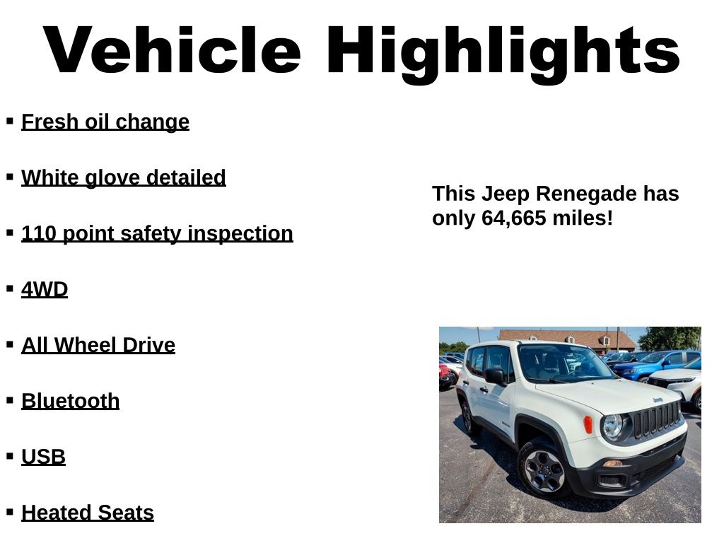 WE ARE THE LARGEST LUXURY PRE-OWNED DEALER IN KENTUCKIANA WITH 49 YEARS OF EXPERIENCE, A+ BBB RATING! THIS JEEP RENEGADE SPORT IS CERTIFIED BY CARFAX – NO ACCIDENTS! ** ONLY 64K MILES ** 4X4/4WD/AWD ** IMPECCABLE SERVICE RECORDS ** NON SMOKER & GARAGE KEPT VEHICLE ** SUPER CLEAN INSIDE AND OUT ** EVERY VEHICLE LOOKS GREAT IN PICTURES... BUT ON A SCALE OF 1-10, MOST DEALERS SELL A 5 OR 6. WE ONLY SELL A 9 OR 10!! ** THIS VEHICLE IS LIKE NEW AND NEEDS ABSOLUTELY NOTHING. WHY PAY MORE WHEN YOU CAN'T TELL THE DIFFERENCE? WHY BUY NEW WHEN YOU CAN BUY SUPERIOR QUALITY FOR LESS?! WE'RE KNOWN IN KENTUCKIANA FOR CLEAN, LIKE-NEW VEHICLES INSIDE AND OUT, AND OUR GOOGLE REVIEWS PROVE IT. STOP SHOPPING AND START DRIVING TODAY! OUR INTERNET SPECIAL IS PRICED TO MOVE QUICKLY, SO DON'T WAIT! ANY QUESTIONS? CONTACT JIMMY SMITH OR RICHARD SPAN AT 812-280-8018.