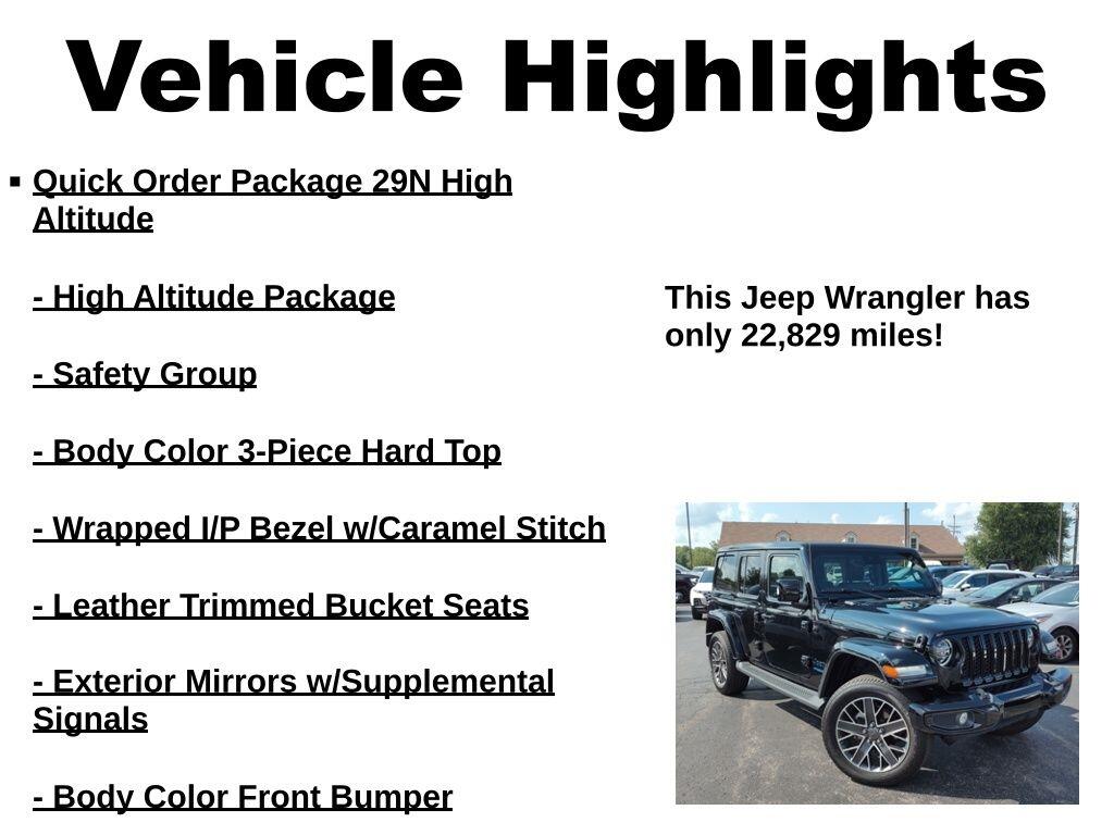 WE ARE THE LARGEST LUXURY PRE-OWNED DEALER IN KENTUCKIANA WITH 49 YEARS OF EXPERIENCE, A+ BBB RATING! THIS JEEP WRANGLER SAHARA HIGH ALTITUDE 4XE IS CERTIFIED BY CARFAX – 1 OWNER & NO ACCIDENTS! ** NON SMOKER & GARAGE KEPT ** ABSOLUTELY FLAWLESS ** ONLY 22K MILES ** OVER 60K MSRP ** POWER SKYTOP ** HEATED LEATHER ** THIS WRANGLER IS A 1 OF A KIND ** WMAY TOO MANY OPTIONS TO LIST ** EVERY VEHICLE LOOKS GREAT IN PICTURES... BUT ON A SCALE OF 1-10, MOST DEALERS SELL A 5 OR 6. WE ONLY SELL A 9 OR 10!! ** THIS VEHICLE IS LIKE NEW AND NEEDS ABSOLUTELY NOTHING. WHY PAY MORE WHEN YOU CAN'T TELL THE DIFFERENCE? WHY BUY NEW WHEN YOU CAN BUY SUPERIOR QUALITY FOR LESS?! WE'RE KNOWN IN KENTUCKIANA FOR CLEAN, LIKE-NEW VEHICLES INSIDE AND OUT, AND OUR GOOGLE REVIEWS PROVE IT. STOP SHOPPING AND START DRIVING TODAY! OUR INTERNET SPECIAL IS PRICED TO MOVE QUICKLY, SO DON'T WAIT! ANY QUESTIONS? CONTACT JIMMY SMITH OR RICHARD SPAN AT 812-280-8018.