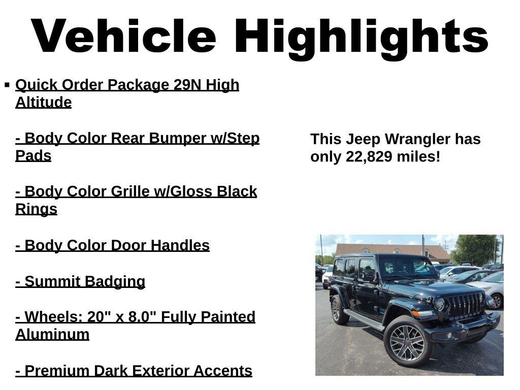 Fresh oil change, White glove detailed, 110 point safety inspection, 4WD, All Wheel Drive, Bluetooth, USB, Heated Seats, Cooled Seats, Leather Seats, Heated Steering Wheel, Navigation System, Remote Start, Rear View Camera / Backup Camera, Sunroof /Moonroof, Panoramic Moonroof, Keyless Entry, Blind Spot Monitor, Adaptive Cruise Control, Forward Collision Warning, Push Button Start, Parking Sensors, Towing Package, Premium Audio, Premium Sound System, One Owner, Local Trade, Sport Package, Non-Smoker, Alloy Wheels, Aluminum Wheels, Backup Camera, Limited Package, Moonroof, Premium Package, Premium Plus Package, Premium Sound Package, Premium Wheels, Rear Climate Package, Technology Package, Tow Package, 2.0L I4 DOHC, Adaptive Cruise Control w/Stop, Advanced Brake Assist, Advanced Safety Group, Auto High Beam Headlamp Control, Blind Spot & Cross Path Detection, Body Color 3-Piece Hard Top, Body Color Door Handles, Body Color Front Bumper, Body Color Grille w/Gloss Black Rings, Body Color Power Locking Fuel Filler Door, Body Color Rear Bumper w/Step Pads, Cold Weather Group, Exterior Mirrors w/Supplemental Signals, Freedom Panel Storage Bag, Full Speed Forward Collision Warning Plus, Heated Front Seats, Heated Steering Wheel, High Altitude Package, Leather Trimmed Bucket Seats, ParkSense Rear Park Assist System, Premium Dark Exterior Accents, Quick Order Package 29N High Altitude, Rear Window Defroster, Rear Window Wiper/Washer, Remote Start System, Safety Group, Summit Badging, Wheels: 20" x 8.0" Fully Painted Aluminum, Wrapped I/P Bezel w/Caramel Stitch.