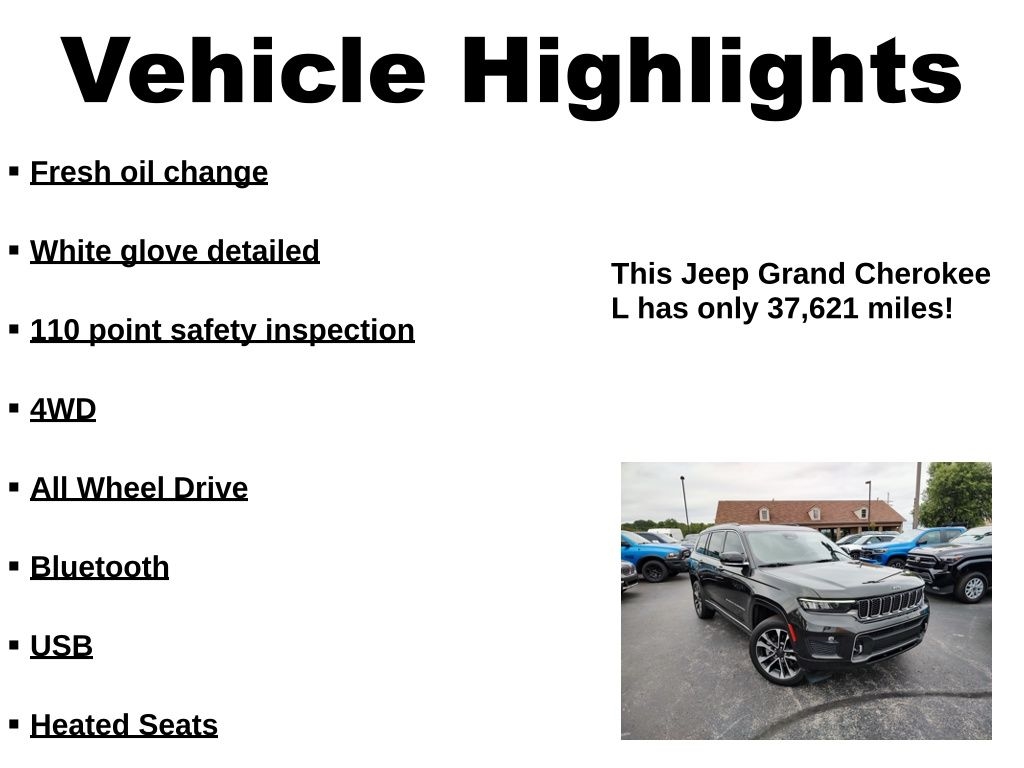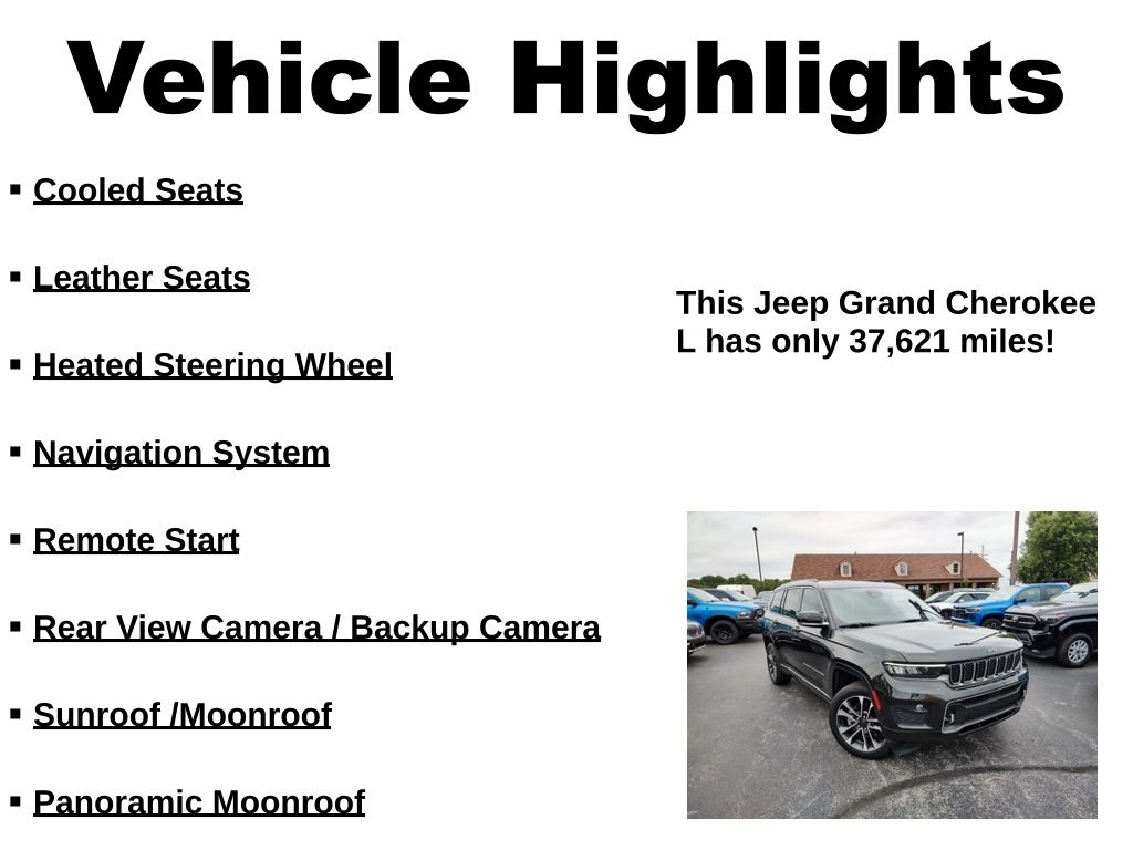 WE ARE THE LARGEST LUXURY PRE-OWNED DEALER IN KENTUCKIANA WITH 49 YEARS OF EXPERIENCE, A+ BBB RATING! THIS JEEP GRAND CHEROKEE L OVERLAND IS CERTIFIED BY CARFAX – 1 OWNER & NO ACCIDENTS! ** VERY RARE COLOR COMBO ** NON SMOKER & GARAGE KEPT VEHICLE ** FLAWLESS CONDITION INSIDE AND OUT ** COMES WITH A GREMAT PREVIOUS OWNER ** ABSOLUTELY LOADED ** WAY TOO MANY OPTIONS TO LIST ** THIS ONE IS LOADED **\ EVERY VEHICLE LOOKS GREAT IN PICTURES... BUT ON A SCALE OF 1-10, MOST DEALERS SELL A 5 OR 6. WE ONLY SELL A 9 OR 10!! ** THIS VEHICLE IS LIKE NEW AND NEEDS ABSOLUTELY NOTHING. WHY PAY MORE WHEN YOU CAN'T TELL THE DIFFERENCE? WHY BUY NEW WHEN YOU CAN BUY SUPERIOR QUALITY FOR LESS?! WE'RE KNOWN IN KENTUCKIANA FOR CLEAN, LIKE-NEW VEHICLES INSIDE AND OUT, AND OUR GOOGLE REVIEWS PROVE IT. STOP SHOPPING AND START DRIVING TODAY! OUR INTERNET SPECIAL IS PRICED TO MOVE QUICKLY, SO DON'T WAIT! ANY QUESTIONS? CONTACT JIMMY SMITH OR RICHARD SPAN AT 812-280-8018.