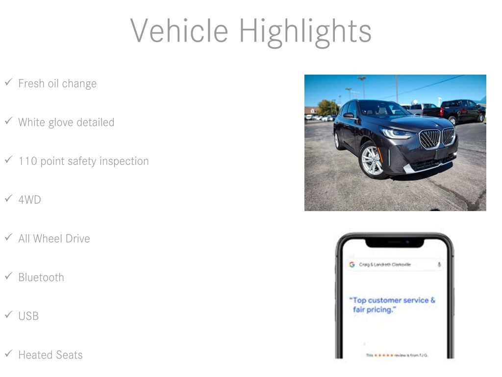 WE ARE THE LARGEST LUXURY PRE-OWNED DEALER IN KENTUCKIANA WITH 49 YEARS OF EXPERIENCE, A+ BBB RATING! THIS BMW X3 XDRIVE IS CERTIFIED BY CARFAX – 1 OWNER & NO ACCIDENTS! ** LESS THAN 900 MILES ** ABSOLUTELY FLAWLESS INSIDE AND OUT ** WAY TOO MANY OPTIONS TO LIST ** JUST LIKE BUYING BRAND NEW WITHOUT HUGE DEALER FEES ** BEST BUY AROUND ** EVERY VEHICLE LOOKS GREAT IN PICTURES... BUT ON A SCALE OF 1-10, MOST DEALERS SELL A 5 OR 6. WE ONLY SELL A 9 OR 10!! ** THIS VEHICLE IS LIKE NEW AND NEEDS ABSOLUTELY NOTHING. WHY PAY MORE WHEN YOU CAN'T TELL THE DIFFERENCE? WHY BUY NEW WHEN YOU CAN BUY SUPERIOR QUALITY FOR LESS?! WE'RE KNOWN IN KENTUCKIANA FOR CLEAN, LIKE-NEW VEHICLES INSIDE AND OUT, AND OUR GOOGLE REVIEWS PROVE IT. STOP SHOPPING AND START DRIVING TODAY! OUR INTERNET SPECIAL IS PRICED TO MOVE QUICKLY, SO DON'T WAIT! ANY QUESTIONS? CONTACT JIMMY SMITH OR RICHARD SPAN AT 812-280-8018.