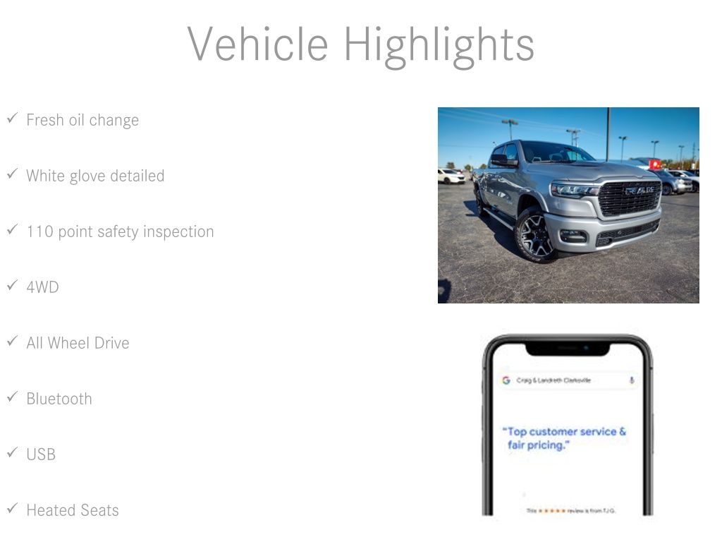 Fresh oil change, White glove detailed, 110 point safety inspection, 4WD, All Wheel Drive, Bluetooth, USB, Heated Seats, Cooled Seats, Leather Seats, Heated Steering Wheel, Navigation System, Remote Start, Rear View Camera / Backup Camera, Sunroof /Moonroof, Panoramic Moonroof, Keyless Entry, Blind Spot Monitor, Adaptive Cruise Control, Forward Collision Warning, Push Button Start, Keyless Ignition, Keyless Start, Towing Package, Bed Liner, Premium Audio, Moonroof, Premium Package, Premium Plus Package, Premium Sound Package, Premium Wheels, Rear Climate Package, Technology Package, Tow Package, Trailer Package.